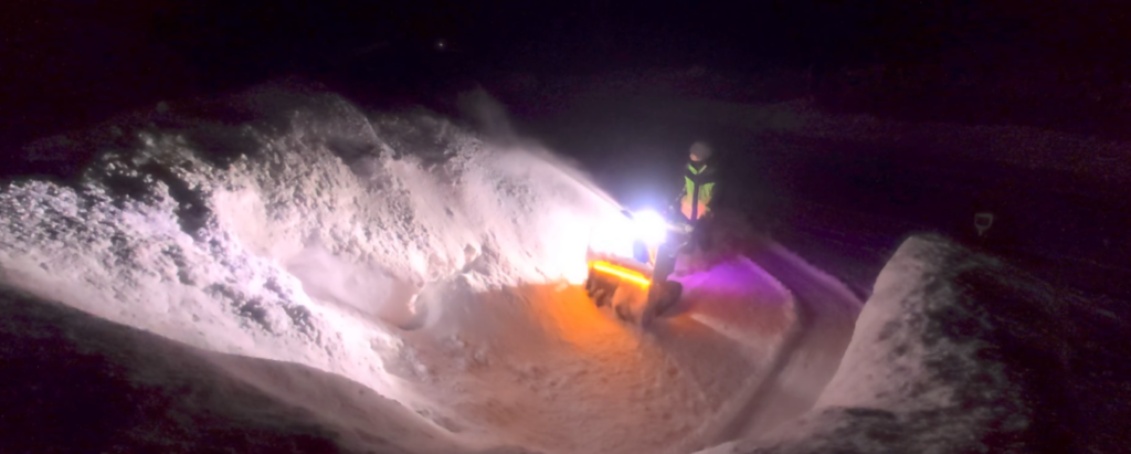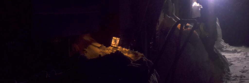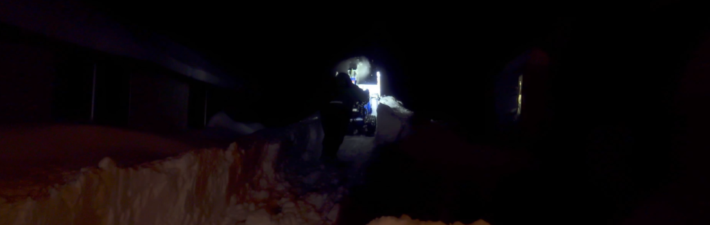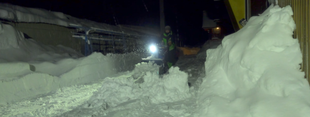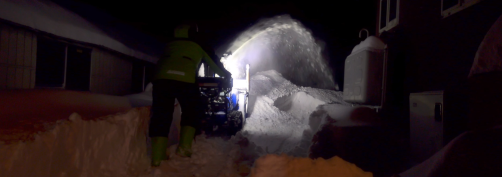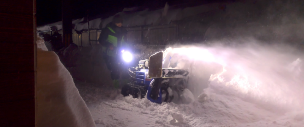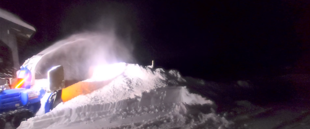 盛るもところもなくなってきたので、さらに奥へと雪を飛ばすために、空回りするクローラー、進めない除雪機を全力で押し込んで前へと進みました