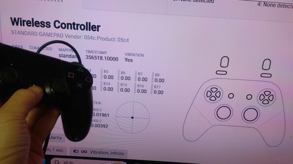 確認のためにパソコンサイトのコントローラーチェックできるサイトを開きまして、パソコンと有線接続してチェックしてみました。