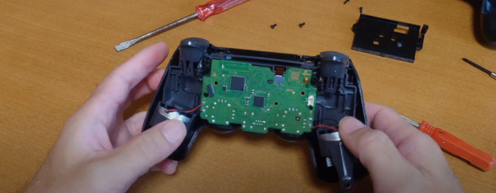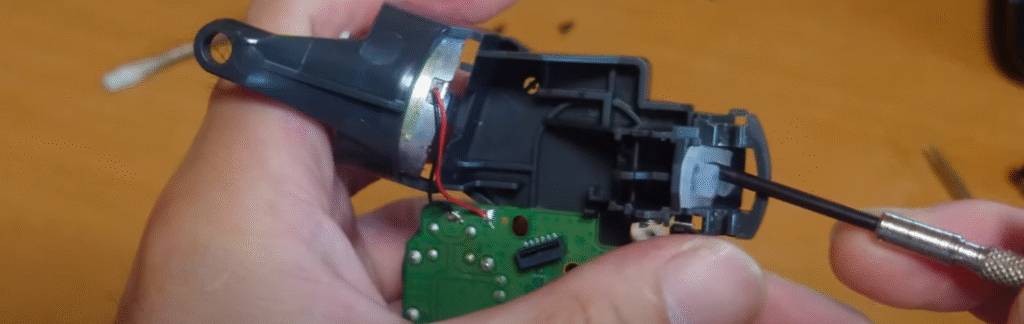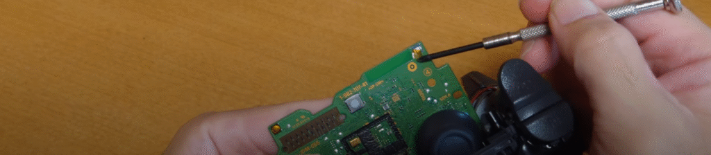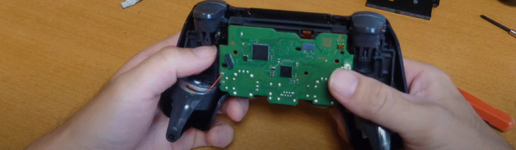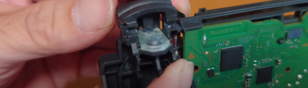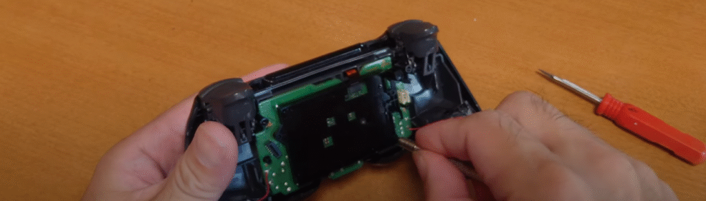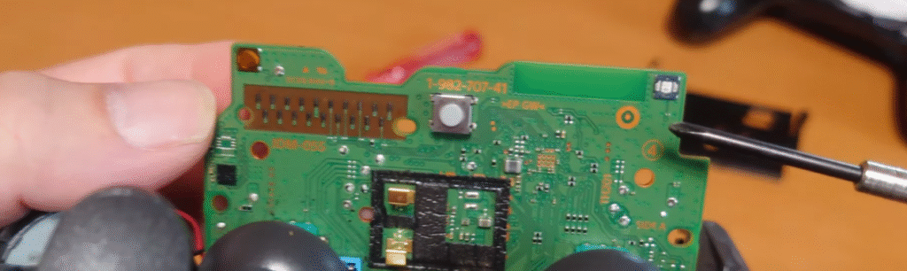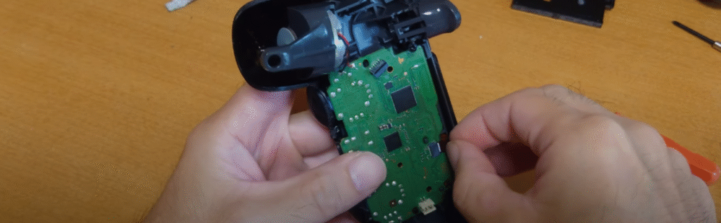 LRスティックをグッと押すと基盤が本体から外れてきますが、振動する部品の配線と基盤が半田付けされているのでこの状態のまま作業しました。