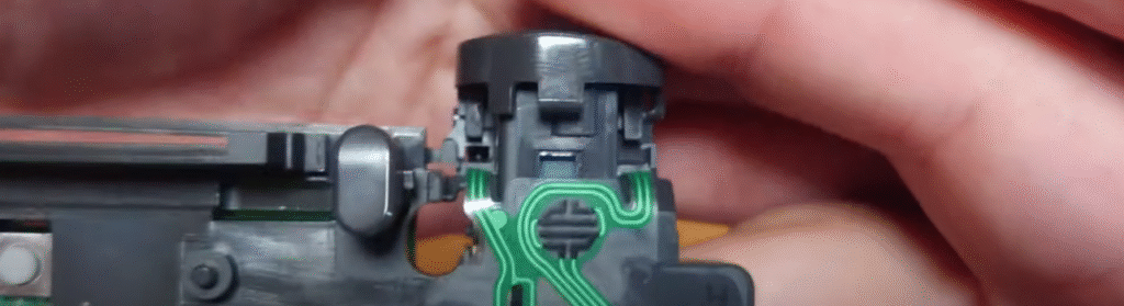 ゴムが切れていますね。そのためにバネのような役割ができていないためカチカチならないR1ボタンですね。